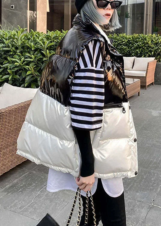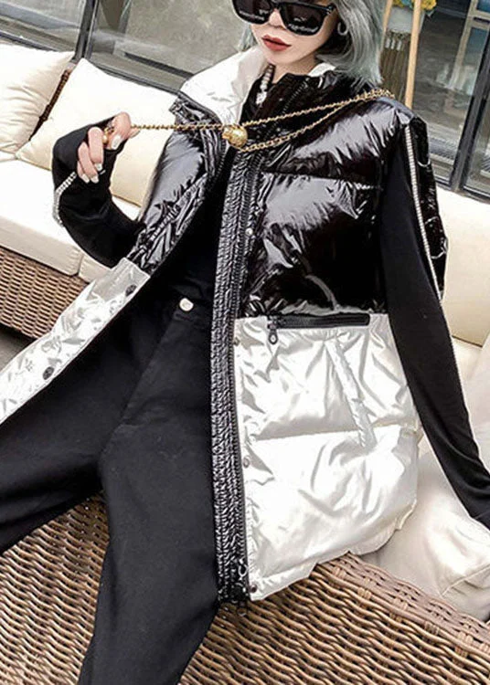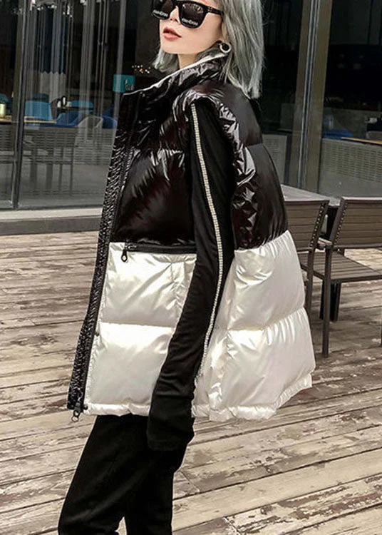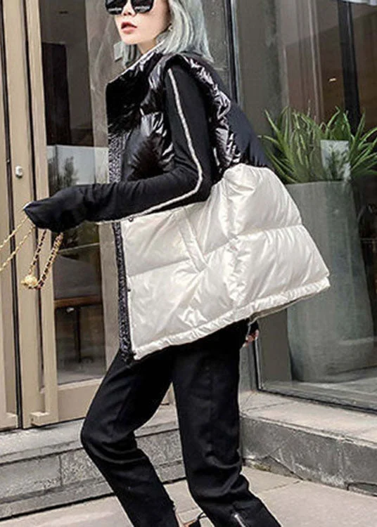 Vintage Black Patchwork White Pockets Bow Winter Sleeveless Puffer Vest